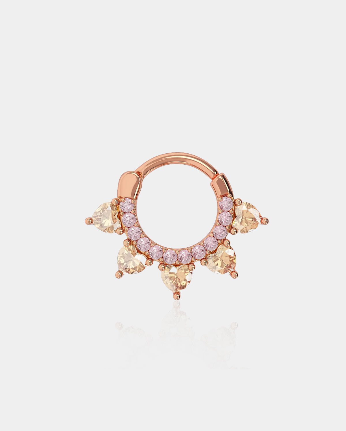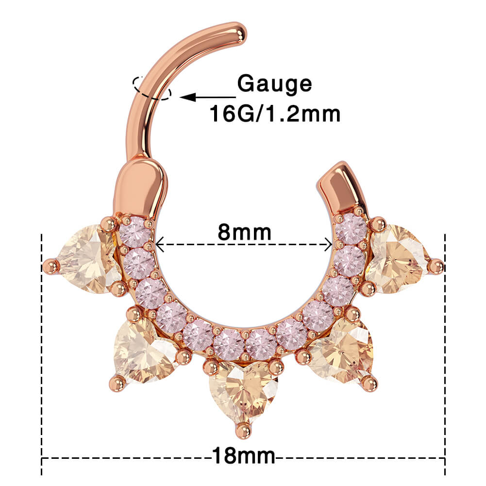 This sumptuous 16 gauge heart septum jewelry is so breathtaking! It features a hoop whose face is paved with micro CZ beads, beyond that, the outer ring is decorated with five heart-shaped clear CZs.