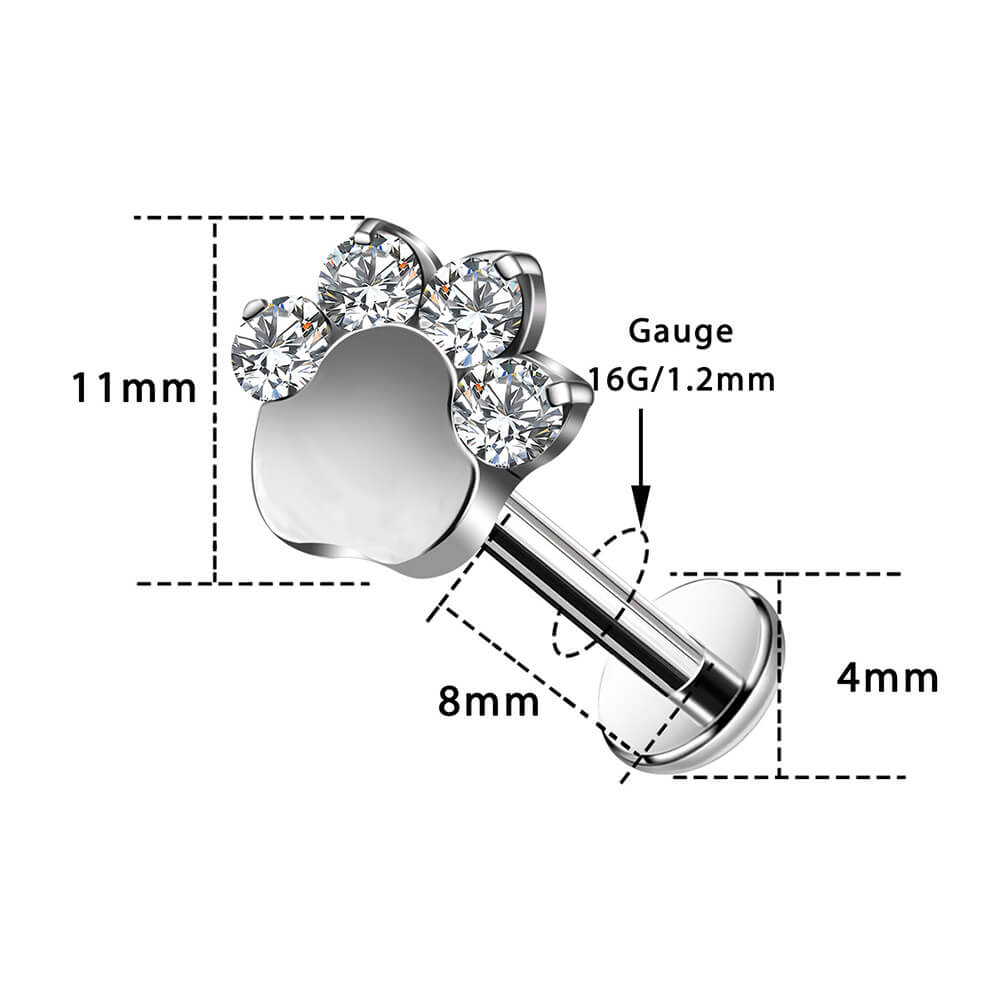This 16-gauge internally threaded titanium labret stud isn't just a beauty, it's also multi-purpose! It's made with an ASTM F-136 titanium post and an internally threaded end that features a super cute puppy paw print charm, detailed with oval clear accents paved as each toe of the dog paw. This Monroe jewelry works well in multiple piercings, including the labret and Monroe as well as cartilage piercings like the tragus, helix, conch, and more. Strength, style, and plenty of purposes.....this cartilage stud body jewelry really does have it all!