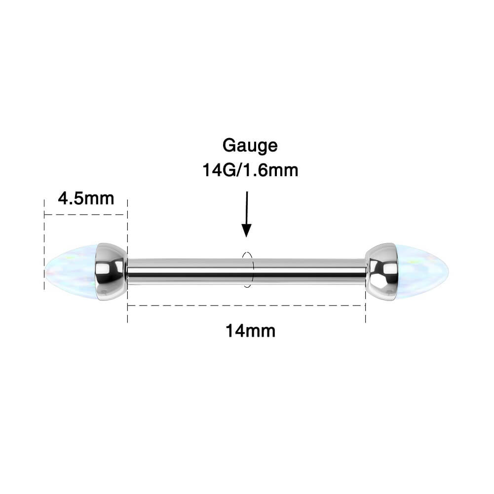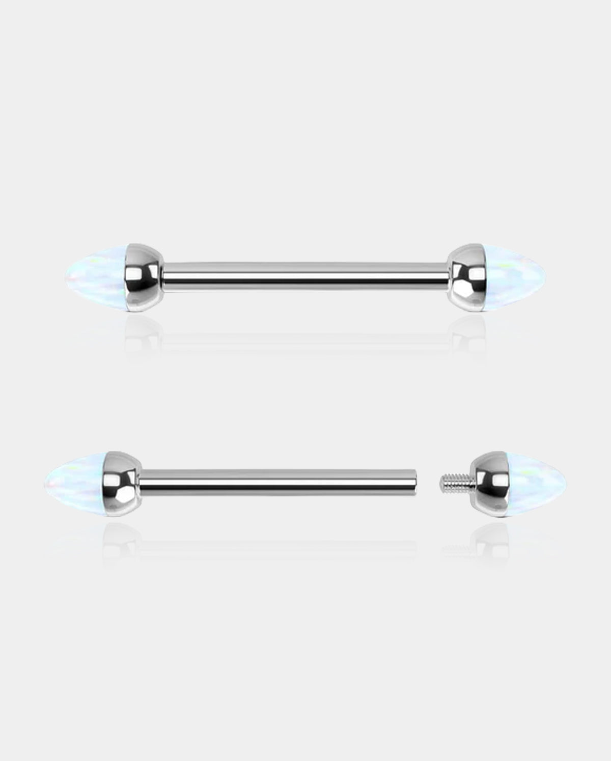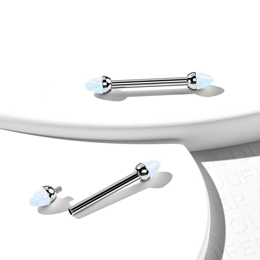 Enhance your nipple piercings with such classic and simple internally threaded nipple barbells. They feature removable and internally-threaded spike-shaped ends made of fire white opal, comfortable for daily use and the safest choice for nipple piercings.