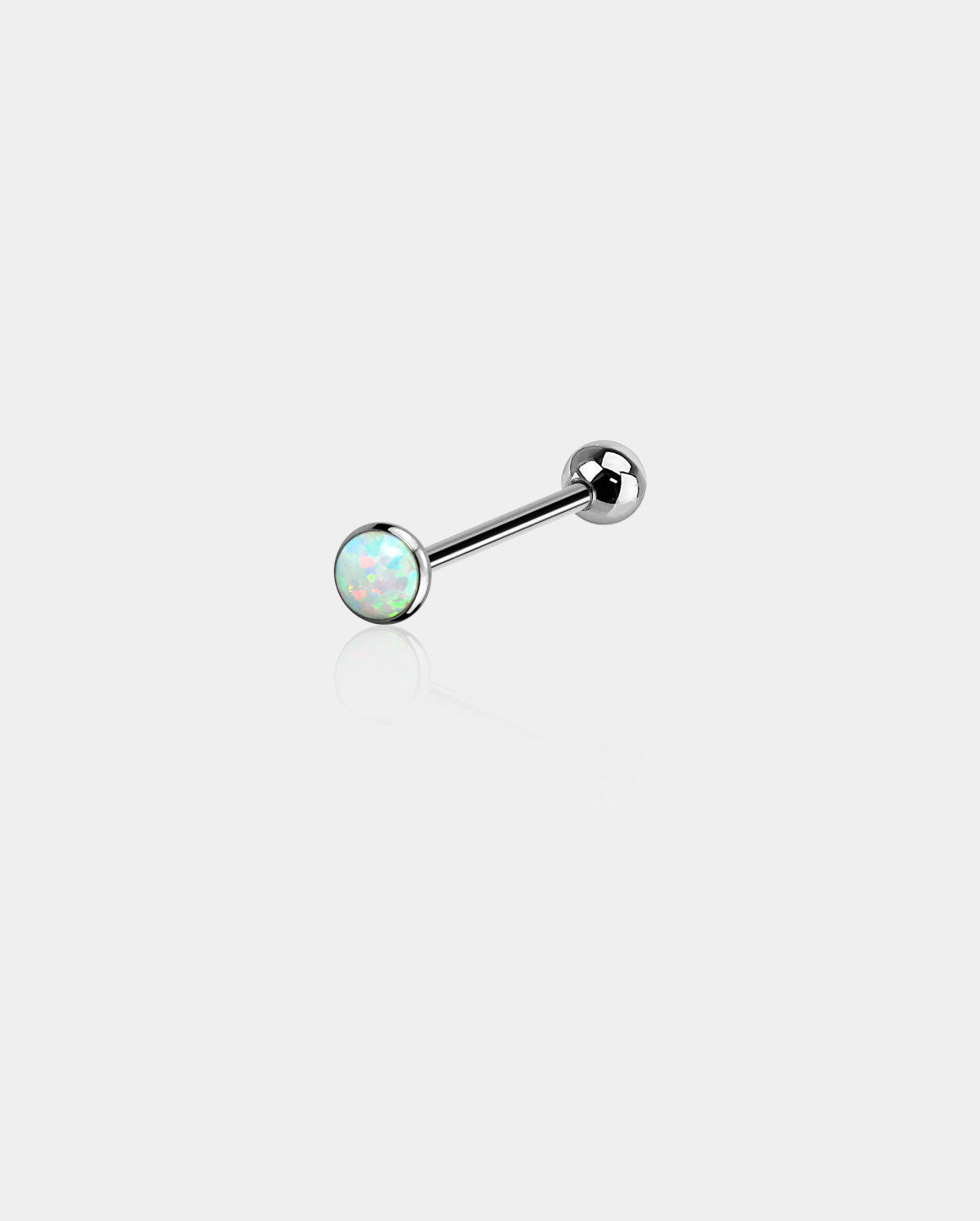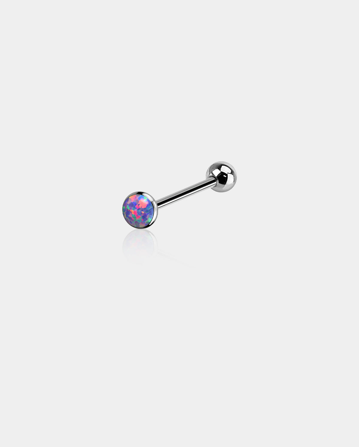 This opal tongue piercing barbell is made of ASTM F136 titanium which is the safest material for sensitive piercings. It features a flat opal top and is very ergonomic, good-looking, also comfortable, stick out your tongue and have everyone saying "Ahhh" when they see this unique piece of tongue barbell. It's available in white and purple.