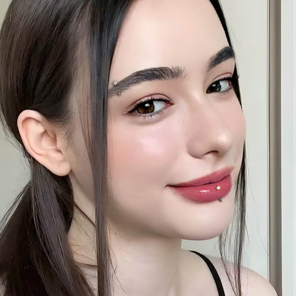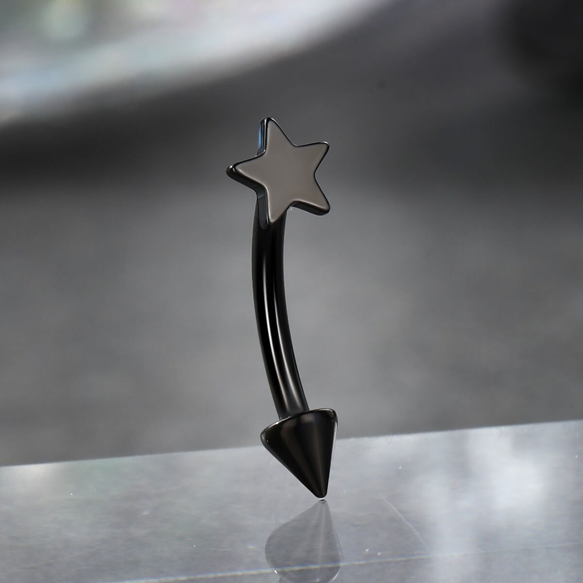 This is a versatile and enchanting piece of eyebrow ring designed for multiple piercing styles. Suitable for a 16 gauge piercing, this accessory features a charming star-shaped top that adds a whimsical and celestial touch to your look. Its design allows it to be used as an eyebrow ring, rook ring, or vertical labret stud, offering flexibility and style options. The high-quality craftsmanship ensures a comfortable fit and long-lasting wear, while the polished finish enhances its overall elegance. Perfect for those who love unique and playful jewelry, this piece adds a sparkling accent to any piercing collection.