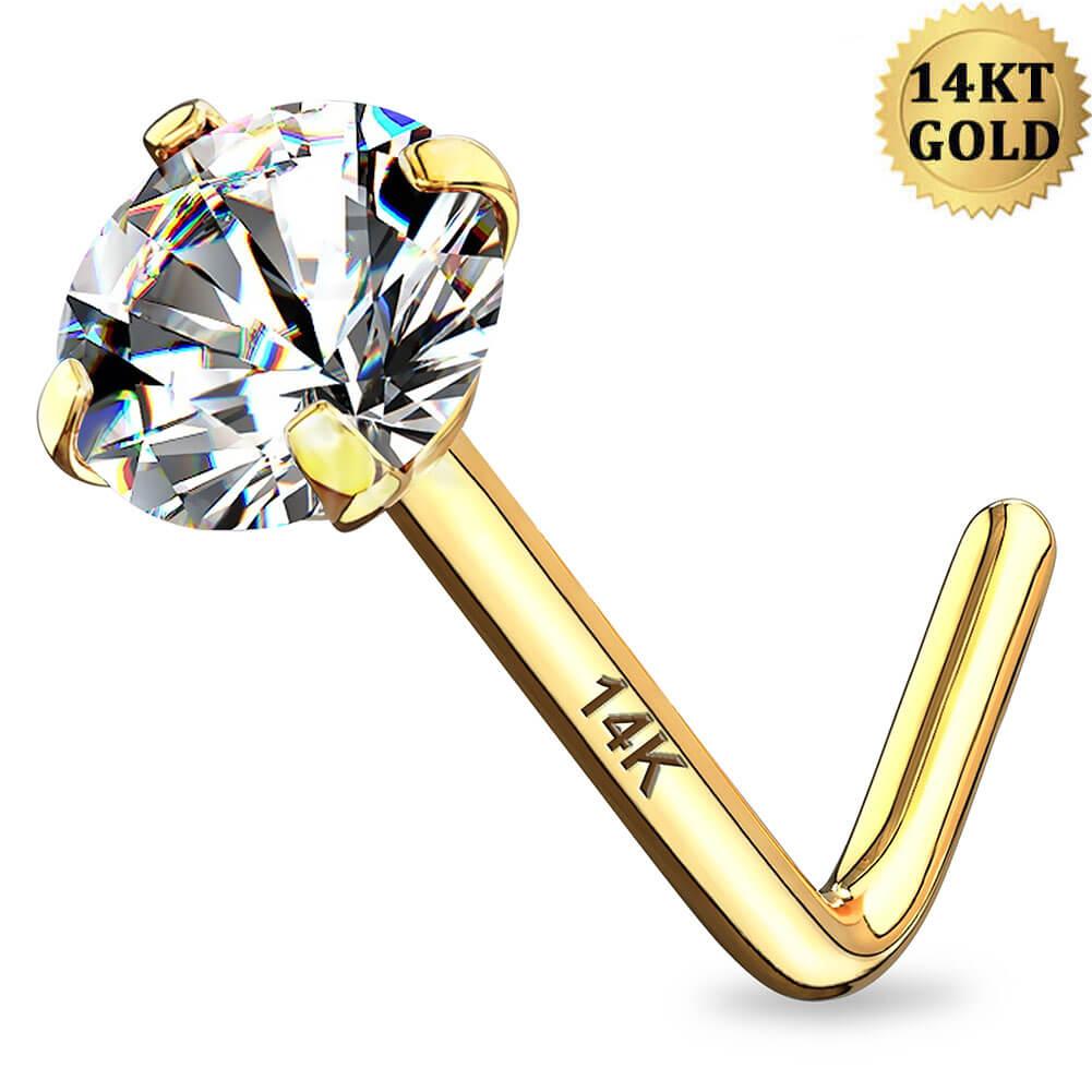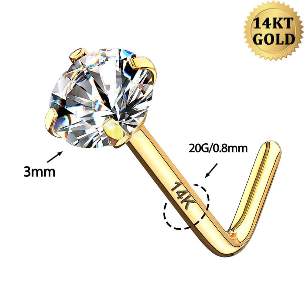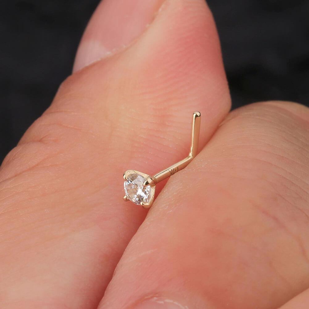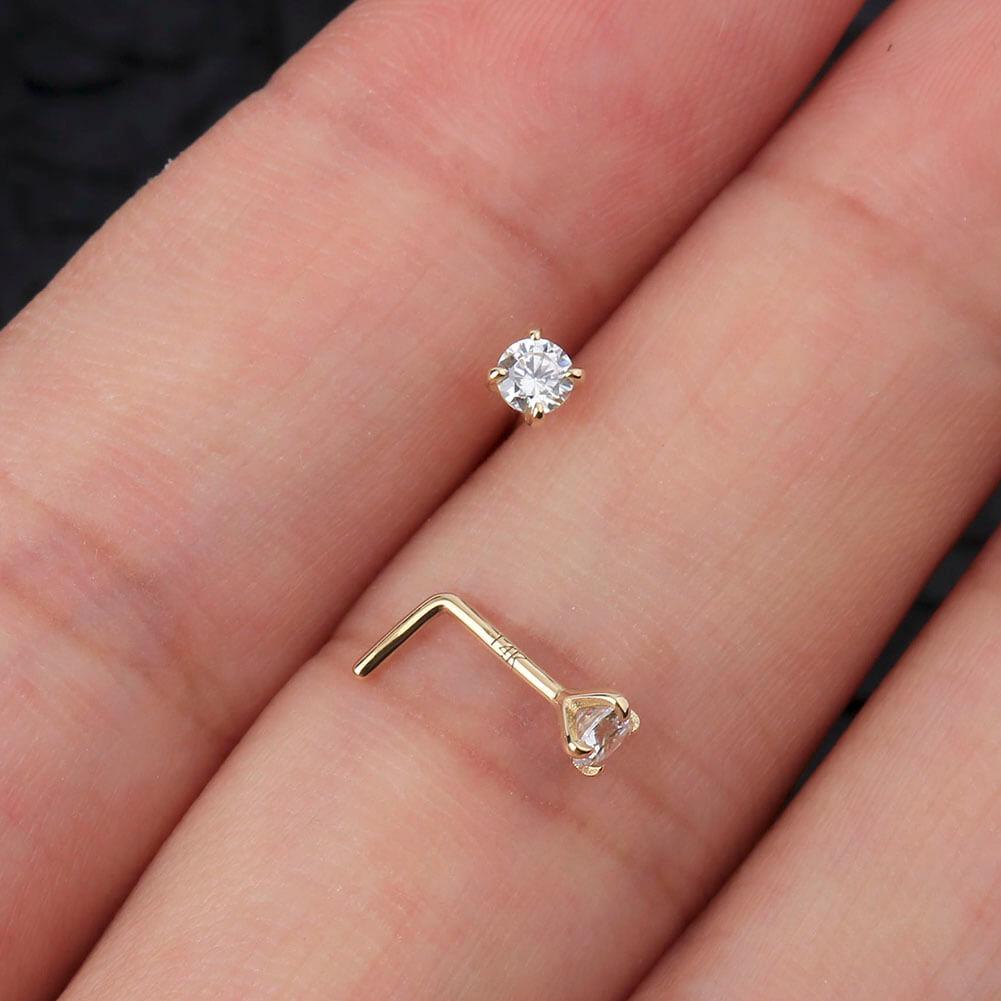 14K Gold L Shape Round CZ Nose Stud - 20G